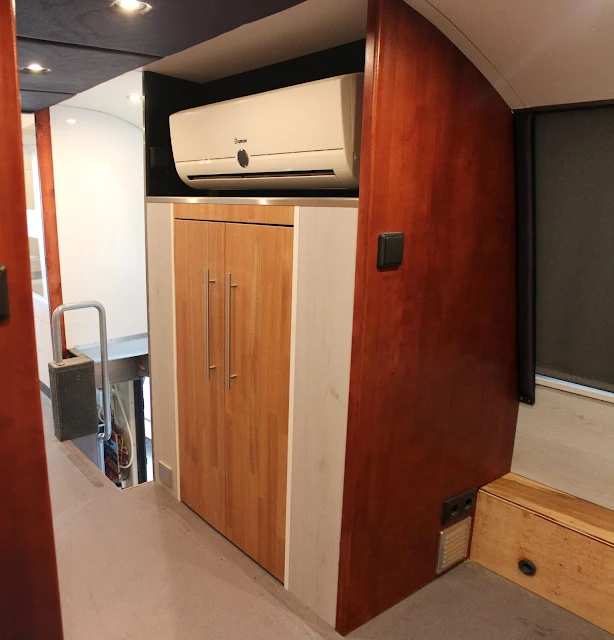 Además de este sistema de aire fresco forzado, siempre se pueden abrir las tres escotillas grandes del techo, por supuesto, o abrir una ventana en el piso inferior. Hay ventanas en las dos puertas y una al lado del asiento del conductor.